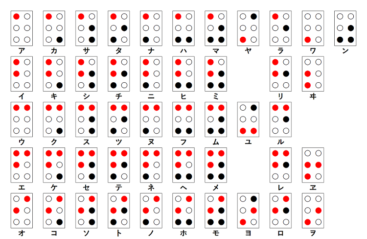 基本には、6個の点組み合わせで、母音と子音の組み合わせて表現します。
