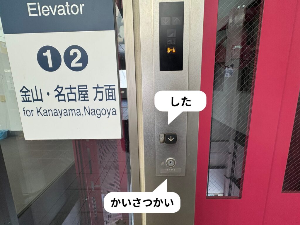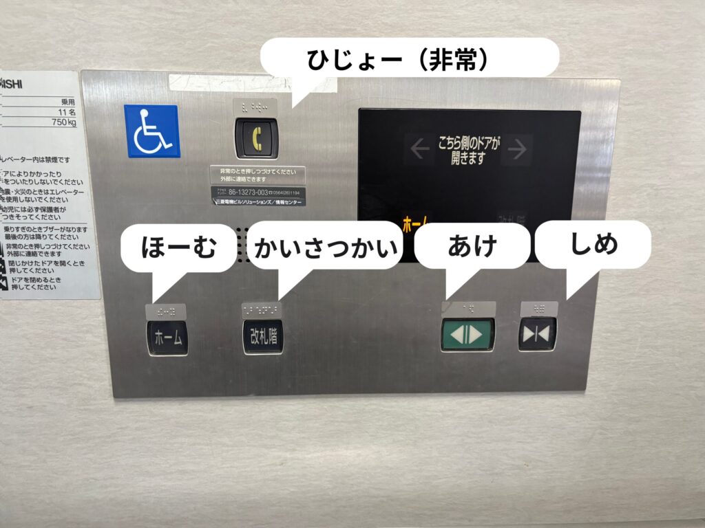 改札階とホーム階を結ぶエレベーターでは、各ボタンの説明があります。