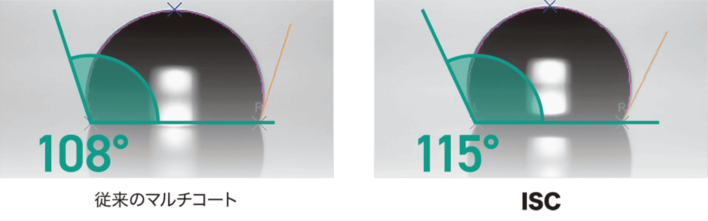 落とした水滴とコーティング表面で形成される角度「接触角」が大きいほど弾きやすいことを表します。