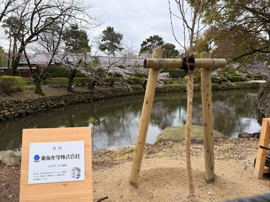 今回植樹された13本のうち1本には、協賛企業として東海光学株式会社の社名を記した看板が設置されました。これらの桜は、今後成長を重ね、岡崎城公園の景観を彩る存在へと育っていくことが期待されています。